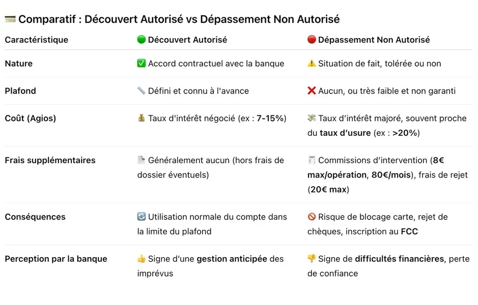 Il est crucial de ne pas confondre le découvert autorisé, qui est un accord négocié, et le dépassement non autorisé, qui est une situation subie. Les conséquences ne sont pas du tout les mêmes, comme le montre ce tableau comparatif.